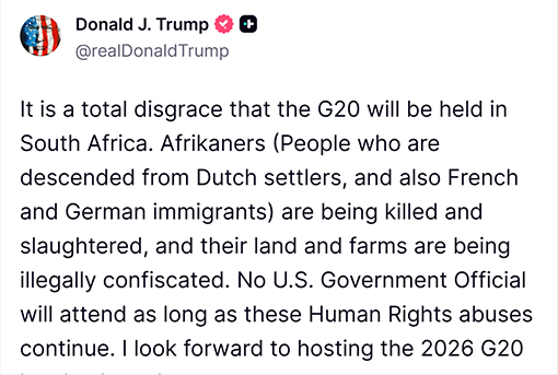 „Es ist eine totale Schande, dass der G20-Gipfel in Südafrika abgehalten wird. Afrikaaner (Menschen, die von niederländischen Siedlern sowie französischen und deutschen Einwanderern abstammen) werden getötet und abgeschlachtet, und ihr Land und ihre Farmen werden illegal konfisziert“, schreibt Trump auf seiner Plattform.